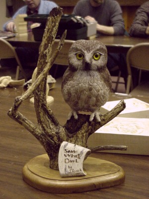 saw whet owl. The drift wood it was mounted on was a prize from a